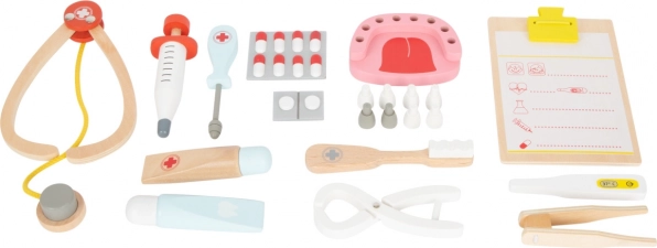 Ta dziecięca lekarska torba oferuje wiele możliwości zabawy i nauki. Zawiera drewniane narzędzia takie jak strzykawka, szczoteczka, wiertło, kleszcze i model zębów. Dzieci mogą stać się małymi dentystami i nauczyć się podstaw higieny dentystycznej poprzez zabawną grę.