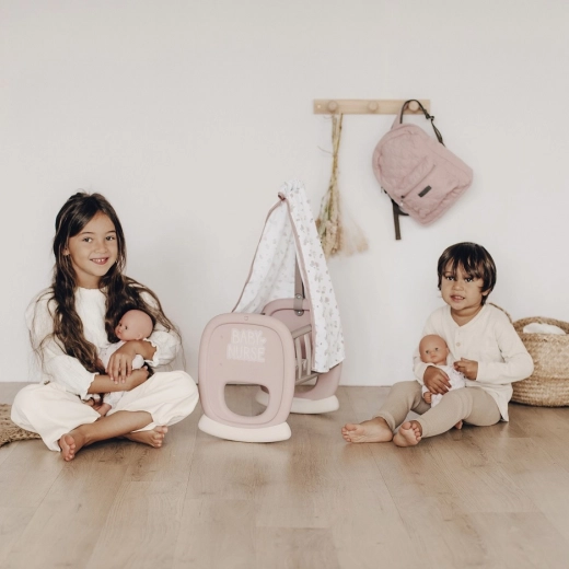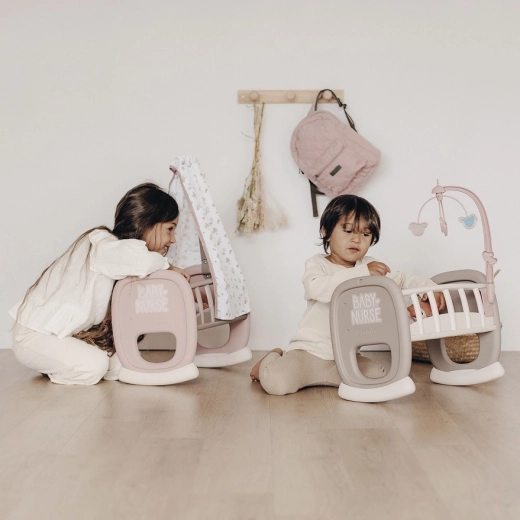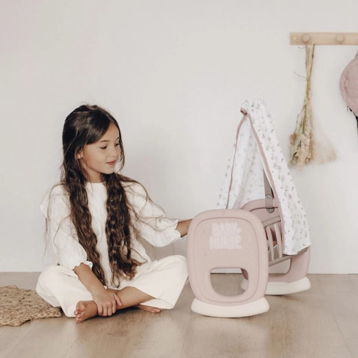 Dziecięca kołyska Smoby Baby Nurse z materiałowym baldachimem zapewnia dzieciom realistyczną zabawę w rodziców. Dzięki zaokrąglonej podstawie bujającej mali opiekunowie mogą delikatnie kołysać swoją lalkę do snu, a miękki baldachim tworzy przytulne otoczenie.