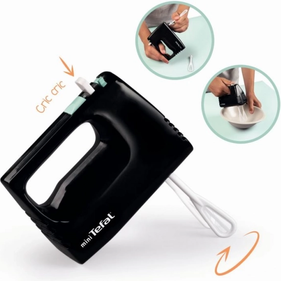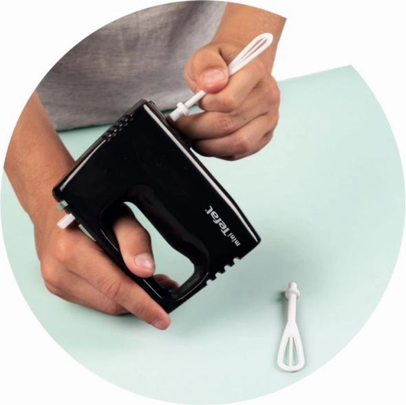 Mini mikser Tefal Express jest idealnym dodatkiem do każdej dziecięcej kuchni. Trzepaczki obracają się mechanicznie za pomocą przycisku i nie wymagają baterii.