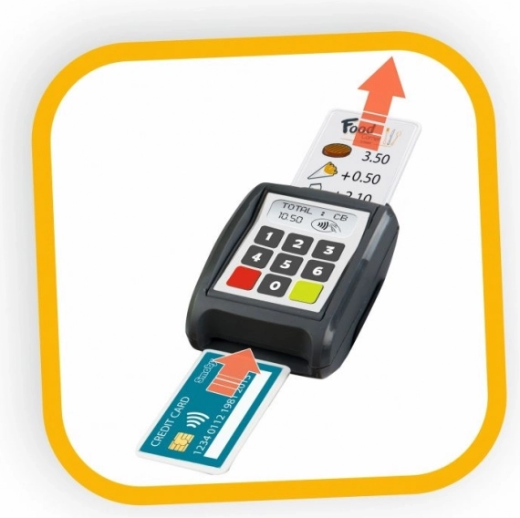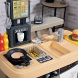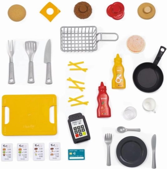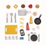 Zestaw zachwyca licznymi detalami: płyta grzewcza, frytkownica, zlew z kranem, piekarnik, lodówka, dozownik napojów, ekspres do kawy oraz haki do zawieszania akcesoriów. Nie brakuje terminala płatniczego, paragonów, karty kredytowej ani drukowanego menu. Po zabawie resztki można „wyrzucić” do kosza. Łącznie 29 dodatków wspiera bogate scenariusze odgrywania ról i rozwój małej motoryki.