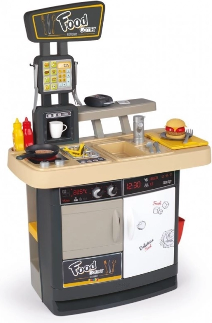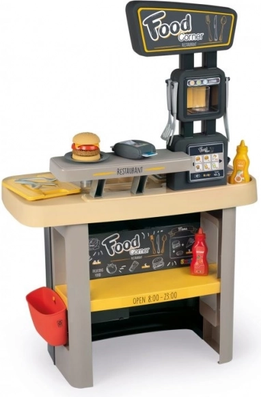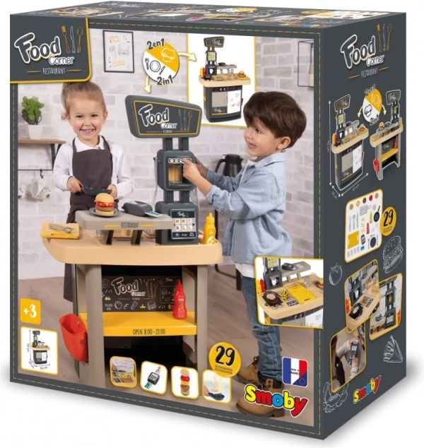 Otwórz własny mały fast food! Dziecięcy Food Corner 2w1 marki Smoby łączy kuchnię i ladę wydawczą z kasą. Dzieci mogą przygotowywać burgery, frytki czy naleśniki i jednocześnie obsługiwać klientów przy ladzie – zupełnie jak w prawdziwej restauracji.