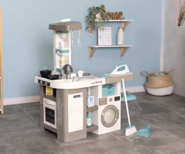 Multifunkcyjna dziecięca kuchnia SMOBY TEFAL Studio 2 w 1 łączy gotowanie, pranie i prasowanie w jednym zestawie do zabawy. Oferuje elektroniczną płytę grzewczą z efektami dźwiękowymi, piekarnik, lodówkę, zlew oraz ekspres do kawy, a jednocześnie pralnię z pralką, suszak i deskę do prasowania z mechanicznym żelazkiem. W komplecie znajduje się 36 akcesoriów dla realistycznej zabawy i rozwoju dziecięcej wyobraźni.