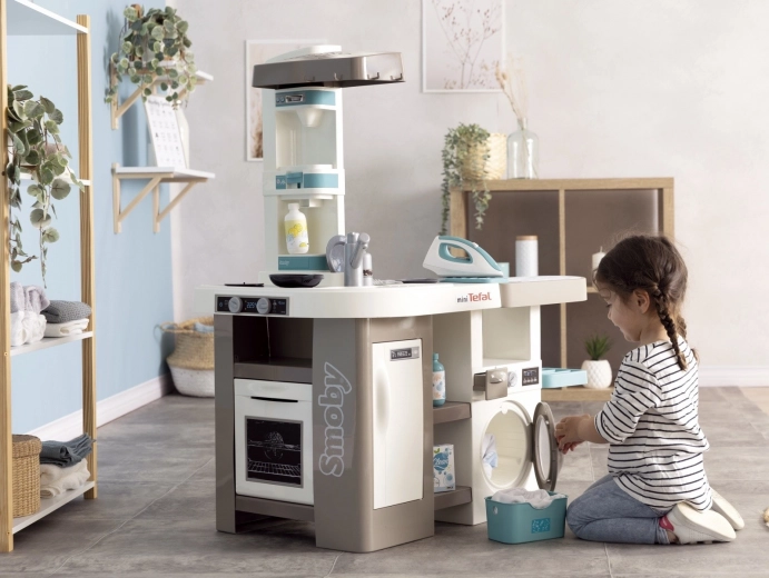 Podaruj dzieciom wspaniały świat zabaw w odgrywanie ról z kuchnią SMOBY TEFAL Studio z pralnią. Realistyczne funkcje, takie jak elektroniczna płyta grzewcza z 2 dźwiękami gotowania, zlew z kranem, piekarnik, lodówka oraz okap z wbudowanym ekspresem do espresso i wodą sodową, zapewniają godziny kreatywnej rozrywki.