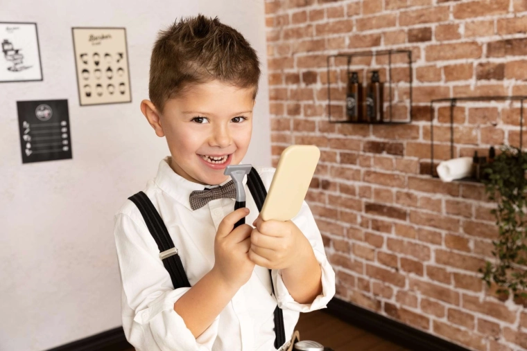Lusterko, nożyczki, grzebień, pędzelek, golarka i inne elementy zapewniają godziny bezpiecznej, kreatywnej zabawy dla dzieci od 3 lat.