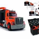 Ciężarówka zawiera przyczepę, która łączy platformę i odczepiany kufer na narzędzia, wspierając organizację i przenośność.