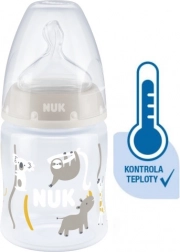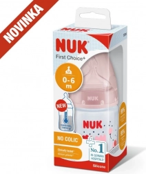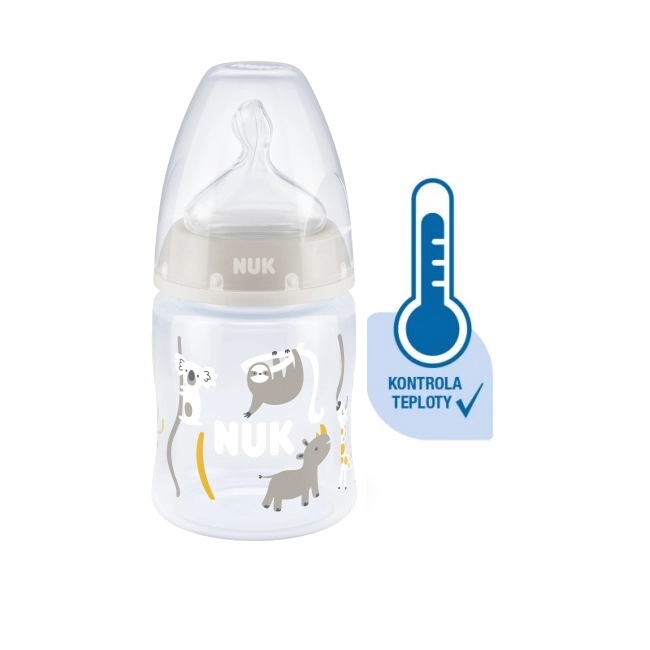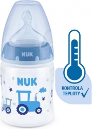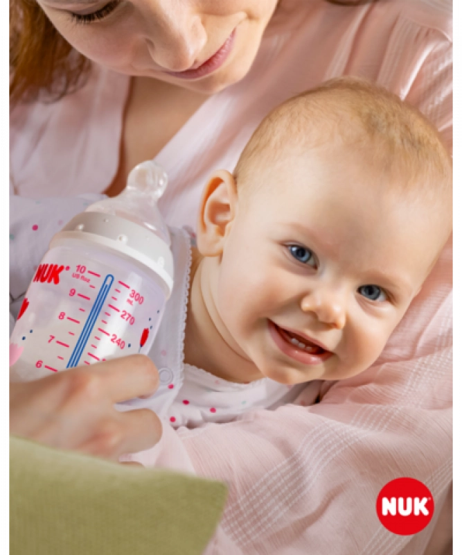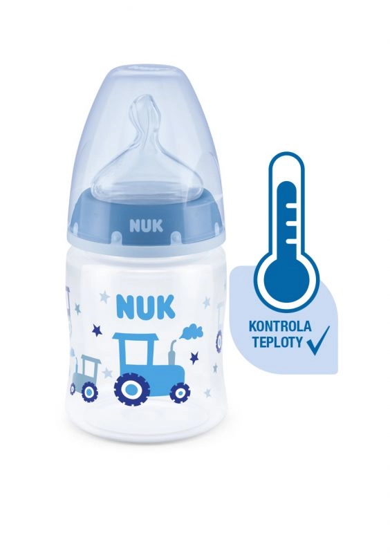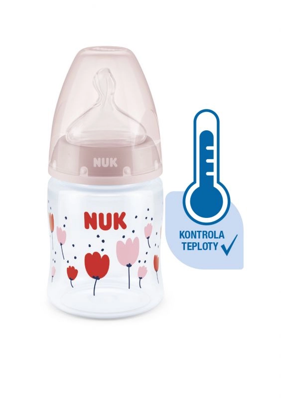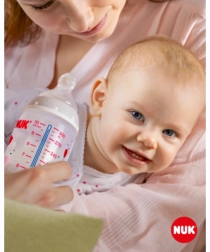 Kontrola temperatury pomaga rodzicom osiągnąć optymalną temperaturę i zapewnić bezpieczne karmienie dziecka. Spokojne i bezpieczne karmienie dzięki kontroli temperatury. Gdy dziecko jest głodne, pokarm w butelce nie powinien być ani zbyt gorący, ani zbyt zimny. Dlatego mamy i tatusiowie przed każdym karmieniem sprawdzają temperaturę pokarmu. Rozpoznanie właściwej temperatury nie jest łatwe. Dlatego opracowano butelki NUK First Choice+ z funkcją kontroli temperatury. Takiej funkcji w tej postaci dotąd nie było. Butelki NUK First Choice+ są teraz wyposażone w nowy wskaźnik temperatury, który pomaga zapobiec podawaniu dziecku zbyt gorącego pokarmu. Wskaźnik wygląda jak termometr, jest umieszczony między podziałkami i zmienia kolor w zależności od temperatury zawartości butelki. Funkcja ta pomaga rodzicom uzyskać optymalną temperaturę podczas karmienia dziecka. Jeśli pokarm jest zbyt gorący, niebieski wskaźnik zmienia kolor na biały. Idealnie pokarm powinien mieć temperaturę ciała (37 °C), co odpowiada niebieskiemu zabarwieniu wskaźnika. Uwaga: kontrola temperatury służy jako dodatkowa pomoc. Przed karmieniem należy też ręcznie sprawdzić temperaturę. Aby to zrobić, zalecamy zakroplić kilka kropel zawartości butelki na wewnętrzną stronę nadgarstka. Najbardziej naturalny smoczek dla Twojego dziecka. Od wielu lat butelki First Choice są pierwszym wyborem do karmienia butelką na wzór karmienia piersią. Dzięki First Choice+ jeszcze bardziej zbliżyliśmy się do natury – umożliwiają zdrowy rozwój szczęki, a dziecko ma wrażenie picia z piersi mamy. Naturalnie i prawidłowo wyprofilowane dla szczęki. Unikalny kształt smoczków NUK wzorowany jest na brodawce sutkowej podczas karmienia piersią. Smoczek pozostawia wystarczająco dużo miejsca na naturalne ruchy ssące języka i szczęki dziecka. Miękki jak pierś mamy. Silikonowy smoczek dzięki nowej miękkiej strefie lepiej dopasowuje się do podniebienia dziecka i zapewnia naturalne odczucia podczas picia. Zapobiega kolce. Udoskonalony system przeciwpołykaniu powietrza Anti-Colic Air System zapewnia płynny przepływ pokarmu bez połykania powietrza. Klinicznie testowane. Dzięki wyjątkowo naturalnemu kształtowi smoczka dzieci bardzo dobrze go akceptują. Oznacza to, że szczególnie nadaje się dla dzieci jednocześnie karmionych piersią i butelką. Butelka dla niemowląt: praktyczny wskaźnik NUK kontroli temperatury, który zmienia kolor z niebieskiego (zimne) na biały (zbyt gorące); bez szkodliwych substancji i zapachu – nie zawiera BPA; łatwe napełnianie i mycie – ekstra szeroka szyjka butelki; pewny chwyt i stabilność – dzięki delikatnie profilowanej butelce i szerokiej podstawie; nieograniczona liczba kombinacji – kompatybilna ze wszystkimi produktami NUK First Choice. Badania naukowe: Moral i wsp., BMC Pediatrics 2010, 10:6. Więcej informacji: http://nuk.com/research. Niezależne badanie rynku wśród 205 pediatrów, Niemcy 2018. 99% matek potwierdziło, że butelka NUK First Choice+ Control nie powoduje kolek. Główne cechy: temperatura zawartości butelki zmienia kolor wskaźnika: jeśli pokarm jest zbyt gorący, niebieski wskaźnik zmienia się na biały; idealna dla dziecięcej szczęki, smoczek z wyjątkowo miękkiego silikonu, 0–6 miesięcy M (średni otwór = do pokarmów dla niemowląt); klinicznie testowane: dla optymalnego łączenia karmienia piersią i butelką; atrakcyjny design