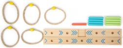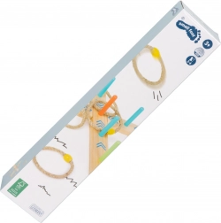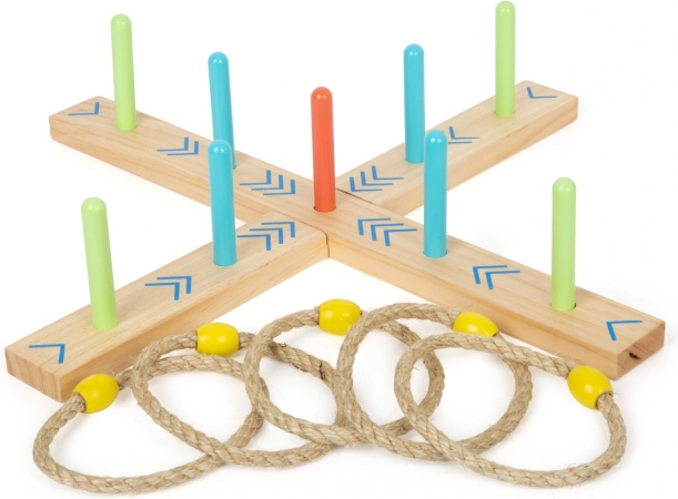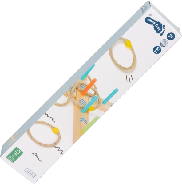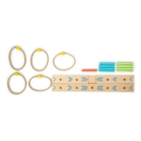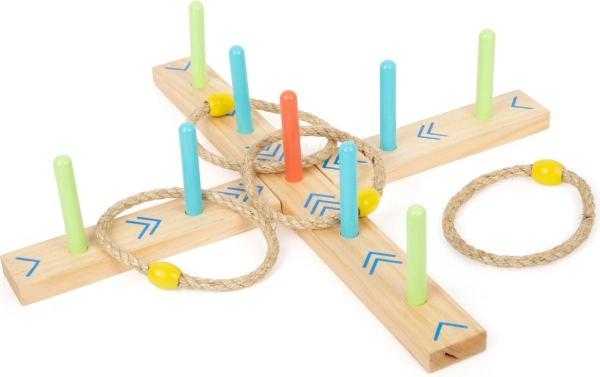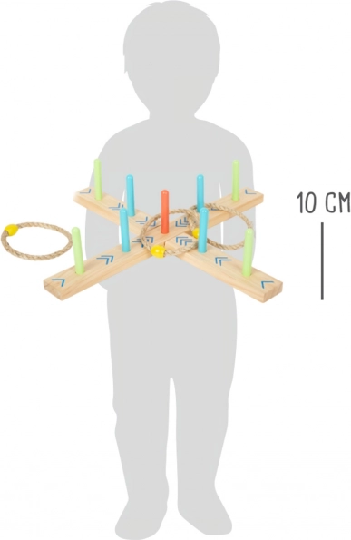 Rzucanie kółkami to wesoła rodzinna gra, która rozwija zręczność i koordynację. Podstawa wykonana jest z 100% certyfikowanego drewna FSC®, co gwarantuje zrównoważone i ekologiczne pochodzenie surowców. Dzięki kolorowym strzałkom na podstawie dzieci mogą łatwo policzyć wynik, bez znajomości liczb. W zestawie znajduje się także podręczny bawełniany woreczek do łatwego przechowywania.