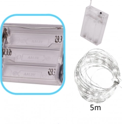 Delikatny druciany łańcuch z 50 LED pięknie rozświetli wnętrze i doda każdej dekoracji świątecznego charakteru. Cienki, plastyczny drucik łatwo ukryjesz w igliwiu lub włożysz do szklanych naczyń, tworząc efektowną instalację świetlną. Zimnobiały kolor światła podkreśli czysty, zimowy look i wyeksponuje detale wystroju.