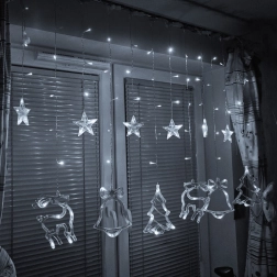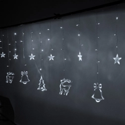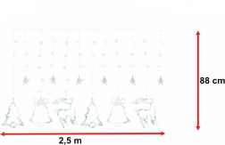 Stwórz w domu magiczną, świąteczną atmosferę dzięki świetlnej kurtynie z motywami renifera, choinki, gwiazdy i dzwonka. 138 diod LED w odcieniu zimnej bieli delikatnie rozświetli wnętrze, oferuje 8 trybów świecenia, a dzięki zasilaniu sieciowemu działa bez kłopotów z bateriami. Wytrzymały przewód gwarantuje długą żywotność, a praktyczne złącza do łączenia pozwalają spiąć kilka zestawów razem.