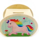 Ta kolorowa skarbonka z jednorożcem motywuje dzieci do finansowej świadomości i nauki wartości pieniędzy. Solidne wykonanie z naturalnego drewna gwarantuje długą żywotność i przyjemny, naturalny wygląd, który pięknie wpasuje się w dziecięcy pokój.