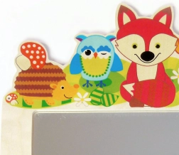 Ten wysokiej jakości drewniany wieszak z figlarnym motywem Leśne zwierzątka wprowadzi do dziecięcego wnętrza kolory i porządek. Dzięki pięciu solidnym haczykom łatwo uporządkujesz kurtki, bluzy, plecaczki i akcesoria. Zintegrowane lustro z niezbijalnego plexi jest lekkie, bezpieczne i idealne do codziennego użytku.