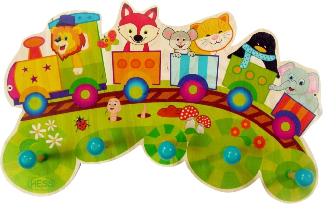 Przyciągający wzrok kolorowy wieszak do pokoju dziecięcego lub przedpokoju z motywem pociągu i pięcioma haczykami na odzież. Wykonany z ekologicznego drewna, użyto ekologicznych farb.