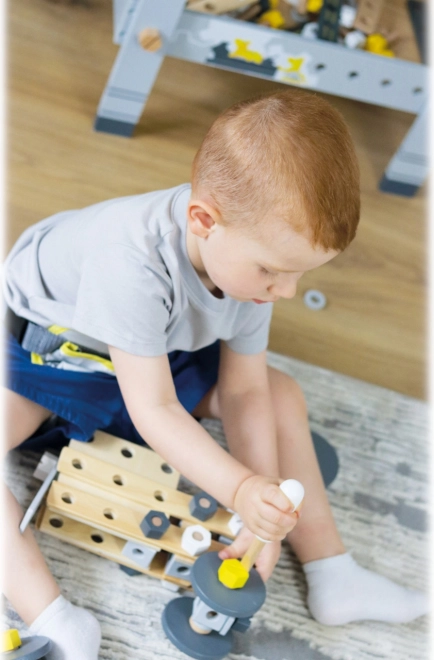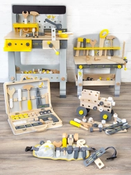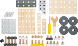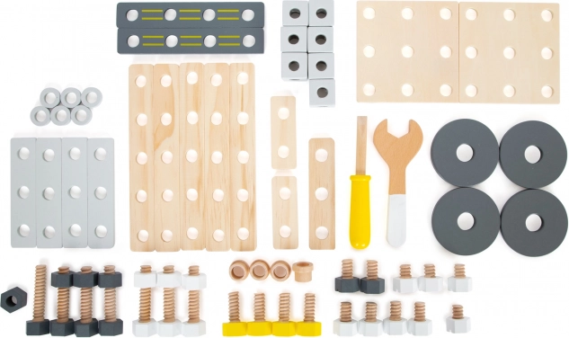 W zestawie znajduje się bogate wyposażenie: listwy i płyty konstrukcyjne z nawierconymi otworami, klocki, koła, adaptery kół, tuleje dystansowe oraz dwa drewniane narzędzia – klucz i śrubokręt. Wszystko przejrzyście schowasz do praktycznego pudełka, dzięki czemu żaden element się nie zgubi.