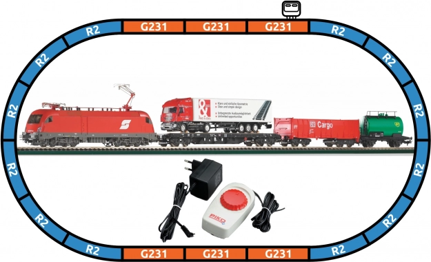 Zestaw startowy z lokomotywą elektryczną Taurus oraz trzema wagonami towarowymi, z których jeden wyposażony jest w luźno umieszczoną ciężarówkę. Zestaw obejmuje owalny układ torów i sterowanie analogowe.
