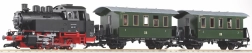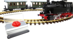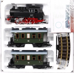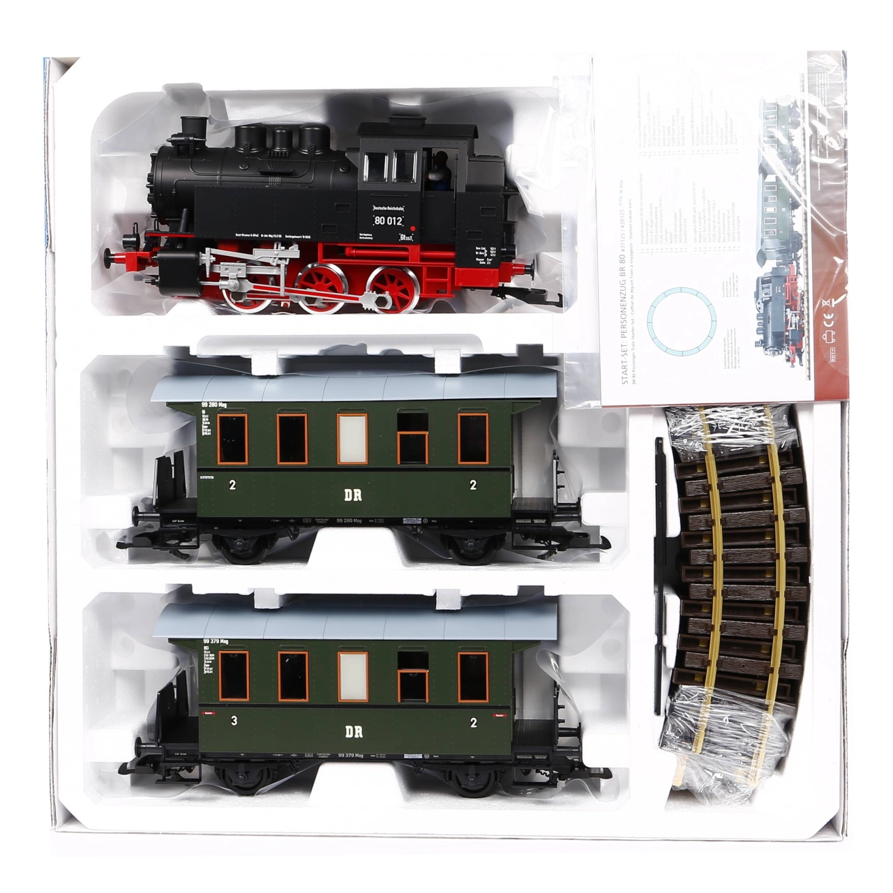 - Kompletny zestaw: lokomotywa BR 80 DR III, 2× wagon osobowy 2. klasy, tory w okręgu, sterownik, zasilanie i akcesoria.