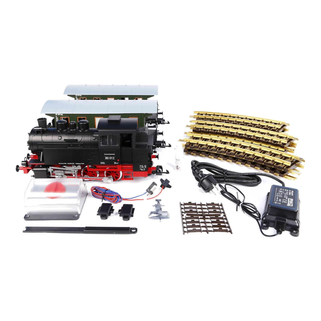 - Parowa lokomotywa BR 80 DR III z dźwiękiem i wytwornicą dymu (1 szt.), wagon osobowy 2 kl. DR III (2 szt.), tory łukowe G-R1 (12 szt.), zacisk przyłączeniowy z kablem, 14 szt. łączników torowych, podstawowy sterownik analogowy, zasilacz, 2× magnet torowy do wyzwalania, pałeczka do rozłączania sprzęgów, płyn do wytwornicy dymu (10 ml), dokumentacja