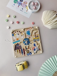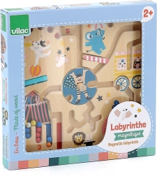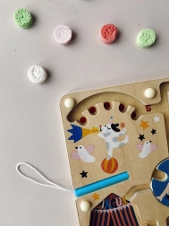 Magnetyczny labirynt VILAC przenosi dzieci od 2 lat w świat cyrku w subtelnych barwach Michelle Carlslund. Magicznym magnetycznym pisakiem przesuwają kuleczki po torach, spotykają akrobatów, zwierzęta i klaunów, a na końcu odkładają każdą kuleczkę na właściwe miejsce zgodnie z kolorem i liczbą. Gra naturalnie rozwija koncentrację i cierpliwość.