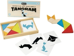 - 7 elementów tangramu, 30 kart z szablonami, drewniane pudełko