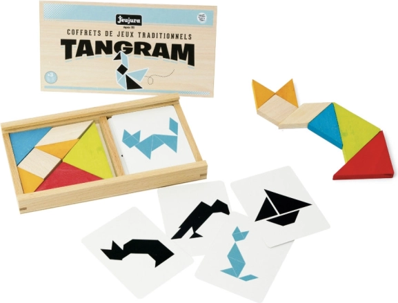 Ten wysokiej jakości tangram marki Jeujura rozwija logiczne myślenie, wyobraźnię i małą motorykę dzieci. Dzięki solidnym drewnianym elementom i kartom z szablonami dzieci mogą układać proste i bardziej wymagające kształty lub tworzyć według własnej fantazji. Drewniane pudełko z sitodrukiem utrzymuje wszystko w porządku i w jednym miejscu.