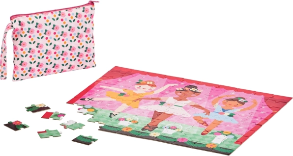 Rozkręć zabawę na scenie z dwustronnymi puzzlami z baletkami! Zestaw zawiera 49 elementów oraz aż 2 oryginalne wzory na przedniej i tylnej stronie. Dzięki praktycznemu etui na zamek jest idealny do domu i w podróży. Wykonany z papieru FSC, a zewnętrzne opakowanie z 100% recyklingowanego poliestru, pakowane bez plastiku.