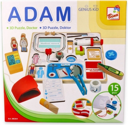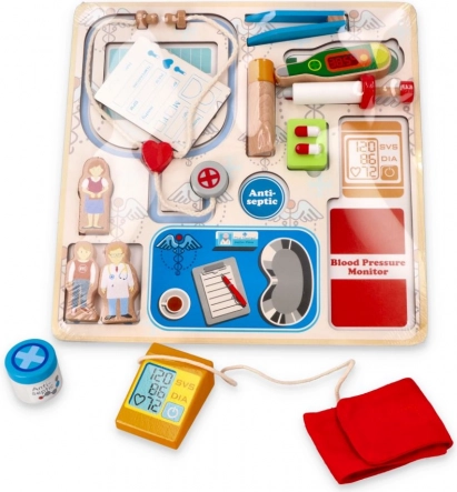 Ta kolorowa układanka wtykowa marki Bino wprowadza dzieci w świat ochrony zdrowia poprzez zabawę. Dzięki wyraźnie uformowanym elementom dzieci łatwo rozpoznają i dopasują stetoskop, termometr, strzykawkę oraz inne akcesoria we właściwe miejsca w planszy. Podczas zabawy ćwiczą chwyt, koncentrację i cierpliwość.