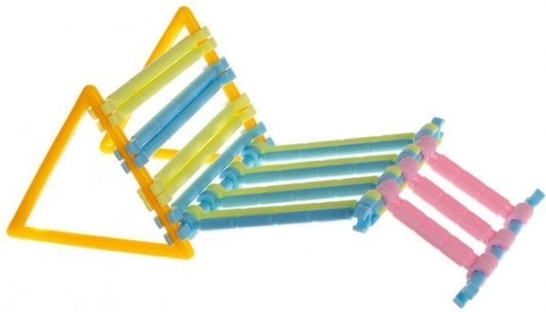 Stavebnica obsahuje prvky w 6 różnych kolorach: pomarańczowy, niebieski, turkusowy, żółty, różowy i fioletowy. To umożliwia tworzenie przestrzennych instalacji z unikalną kolorystyką.