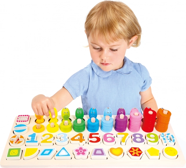 Dzięki kolorowym kształtom i liczbom zabawka wspiera naukę podstaw liczenia i rozpoznawania kształtów.