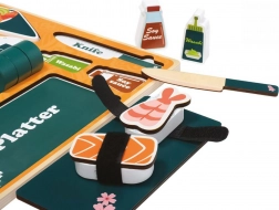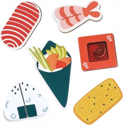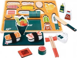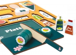 Zestaw zawiera drewniane komponenty, takie jak sushi, sosy, sztućce i nożyk do "cięcia", co pozwala na realistyczną i kreatywną zabawę. Ta gra jest odpowiednia dla dzieci od 36 miesięcy, jednak zaleca się nadzór osoby dorosłej dla dzieci do lat 3.