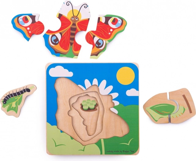 Ta warstwowa drewniana układanka to idealna pomoc edukacyjna dla małych odkrywców. Dzieci krok po kroku poznają, jak z jajeczka powstaje gąsienica, poczwarka, a następnie piękny motyl. Dzięki czterem warstwom i solidnym elementom układanie jest intuicyjne i przyjemne.