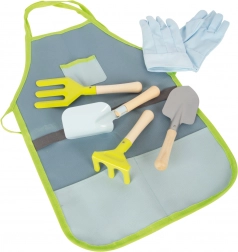 • Kompletny zestaw: fartuch, rękawiczki i 4 sztuki narzędzi (szpadel, grabki, łopatka, widelec)