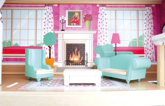 Ten elegancki, trzypiętrowy domek dla lalek oferuje w pełni wyposażone pokoje – kuchnię, salon, łazienkę i sypialnię. Winda, wewnętrzne schody i balkon dodają zabawie realizmu. Wysokiej jakości drewniane wykonanie jest trwałe i bezpieczne, idealne do codziennych zabaw rodzeństwa i przyjaciół.