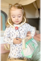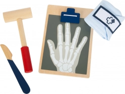 W zestawie bogate akcesoria: stetoskop, termometr z regulowaną temperaturą, strzykawka z ruchomym mechanizmem, otoskop z prawdziwą lupą, a także ciśnieniomierz z mankietem i balonikiem, płyn do dezynfekcji z pompką, buteleczki, łyżeczka, pęseta, skalpel, młoteczek neurologiczny oraz tekstylnie maseczki. Dzieci wypróbują opiekę nad „pacjentem”, poznają podstawy pielęgnacji i oswoją strach przed wizytą u lekarza.