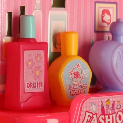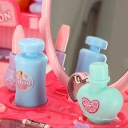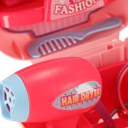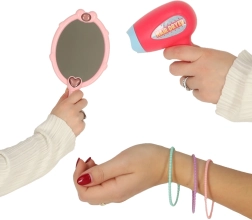 W zestawie znajdują się grzebyki, lusterko, buteleczki, akcesoria do włosów i inne rekwizyty do realistycznej zabawy w salon fryzjerski i kosmetyczny.