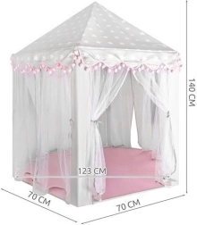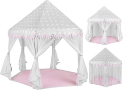 Magiczny dziecięcy namiot Kruzzel w szaro‑różowej kombinacji ze wzorem gwiazdek zamieni każdy pokój w bajkową kryjówkę. Oferuje przestronny sześciokątny rzut, 6 wejść z lekkimi zasłonkami, łatwy montaż bez narzędzi oraz dekoracyjne pompony dla jeszcze większej magii zabawy.