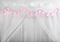 Szaro‑różowe połączenie z gwiazdkami i dekoracyjnymi pomponami zachwyci dzieci i rodziców. Świetnie wygląda także z dodatkowym oświetleniem.