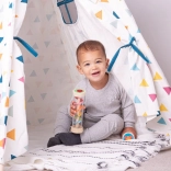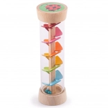 Dzięki ruchowi koralików od góry do dołu deszczowy kijek wytwarza delikatny dźwięk przypominający deszcz, co jest uspokajające dla dzieci.
