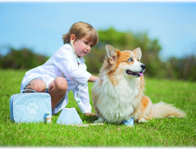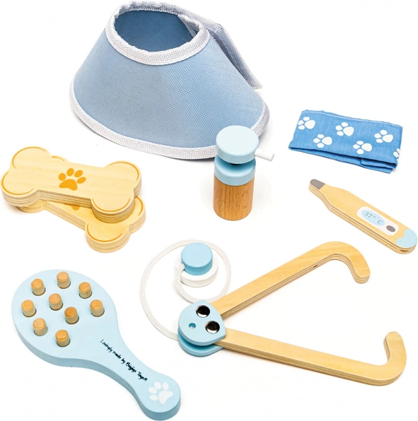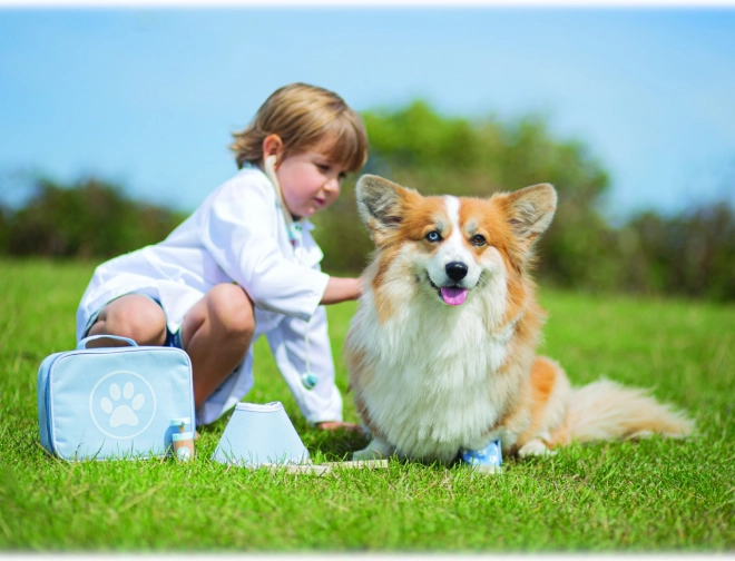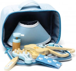 Kompletny weterynaryjny kuferek pozwala dzieciom opiekować się pluszakami i figurkami zwierząt jak prawdziwy lekarz. W zestawie znajdują się narzędzia, takie jak stetoskop, termometr, otoskop, strzykawka, bandaż, szczotka, kołnierz ochronny i inne akcesoria. Wszystko mieści się w wytrzymałej torbie tekstylnej z łapką, idealnej do przenoszenia i przechowywania.