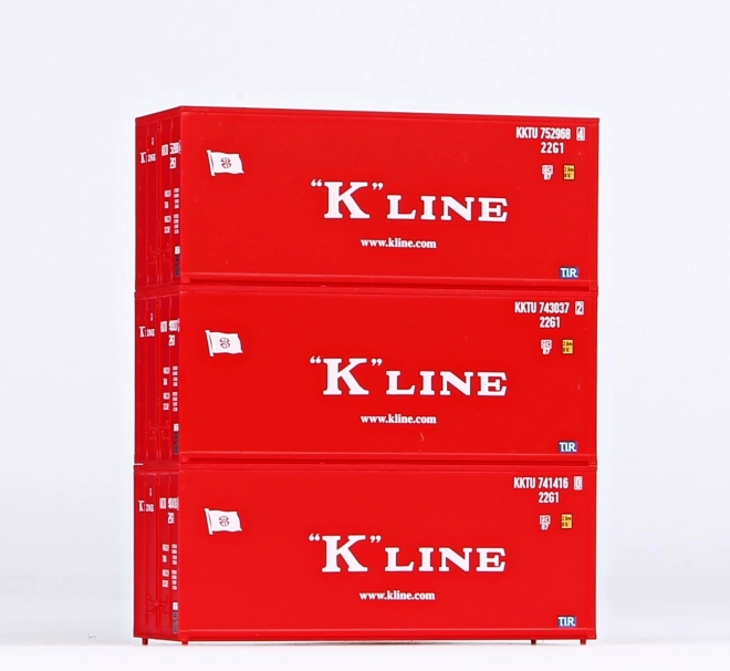 Ten zestaw zawiera trzy szczegółowo odwzorowane dwudziestostopowe kontenery K-Line, idealne do wymiany lub zastąpienia na wagonach platformowych i kieszeniowych dzięki nisko położonemu środkowi ciężkości, co zapewnia optymalne właściwości jezdne.