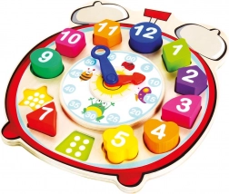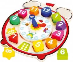 Ta wielofunkcyjna drewniana zabawka edukacyjna łączy układankę z zegarem. Kolorowe elementy o różnych kształtach z cyframi wkłada się w odpowiadające im otwory, a pod elementami zaznaczone są kropki dla łatwiejszej orientacji i pierwszego liczenia. Obracane wskazówki godzinowa i minutowa pomagają dzieciom zrozumieć zasadę mierzenia czasu w ciekawy i obrazowy sposób.