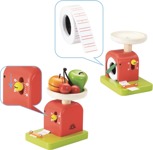 Solidna konstrukcja z litego drewna i wysokiej jakości lakier w żywych barwach zapewniają długą trwałość i bezpieczne użytkowanie. Zabawka wspiera rozwój motoryki małej, myślenia logicznego i wyobraźni podczas zabawy w sklep, kuchnię czy na straganie.