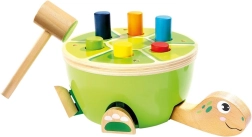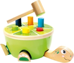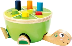 Ta żółwia ławeczka do wbijania od Bino to idealny wybór na pierwsze gry motoryczne. Dzieci przy pomocy drewnianego młotka z miękkim filcowym pokryciem bezpiecznie wbijają kolorowe kołeczki w pancerz. Podczas zabawy naturalnie rozwijają się mała motoryka, koordynacja ręka–oko oraz koncentracja, a dzięki wesołemu wyglądowi zabawka utrzymuje uwagę na długi czas.