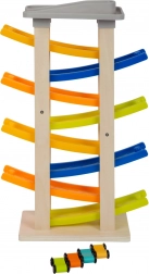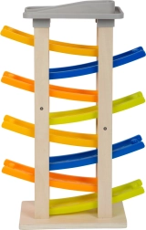 Poznaj ten unikalny tor wyścigowy z ośmioma rampami, który zachwyci każdego małego zawodnika. Na szczycie toru znajduje się wygodny parking dla czterech drewnianych samochodzików. Ta zabawka wspiera akustyczne postrzeganie dzięki stukającym dźwiękom, które wytwarzają samochodziki podczas zjazdu. Dzięki swojej szerokiej podstawie tor jest wyjątkowo stabilny i bezpieczny.