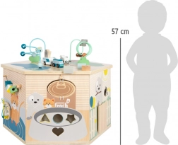Duża drewniana kostka motoryczna w kształcie sześciokąta oferuje 8 stron pełnych aktywności dla dzieci od 12 miesięcy. Dzięki dwustronnej pokrywie z koralikowym labiryntem i kolejką po jednej stronie oraz tablicy kredowej po drugiej, dzieci doświadczą zarówno kreatywnej, jak i motorycznej zabawy. W zestawie znajdują się 3 autka, dzwoneczek stymulujący słuch oraz praktyczna przestrzeń do przechowywania. Stabilne wykonanie z wysokiej jakości drewna z gumowanymi nóżkami chroni podłogę i pasuje do każdego wnętrza.