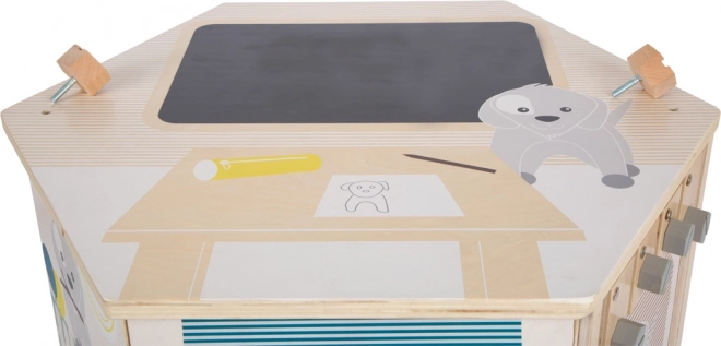 Solidne drewno, subtelne kolory i gumowane nóżki delikatne dla podłogi. Hojne wymiary 57 × 50 × 43 cm oraz wysokość powierzchni do zabawy 32 cm gwarantują wygodę i świetną stabilność.