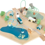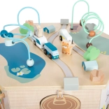 Wyjmowana i dwustronna pokrywa może być mocowana z obu stron bez użycia narzędzi: u góry służy jako koralikowy labirynt z kolejką, po odwróceniu dzieci zyskują tablicę kredową do rysowania. Pokrywę można używać także osobno jako podkładkę do zabawy na podłodze. Wewnątrz kostki jest sporo miejsca na przechowywanie akcesoriów i zabawek, a w zestawie znajdują się trzy pojazdy (minibus, kamper, przyczepa). Subtelne kolory i widoczne usłojenie drewna wpasują się w każdy dziecięcy pokój.