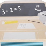 Pokrywę można szybko obrócić bez narzędzi: z jednej strony koralikowy labirynt z kolejką, z drugiej tablica kredowa do rysowania i pierwszych prób pisania. W opakowaniu znajdziesz 3 pojazdy – minibus, kamper i przyczepę – do nieskończonych scenariuszy zabawy.
