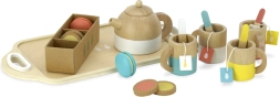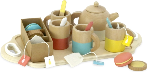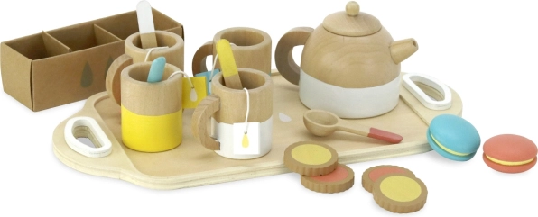Zestaw zawiera: 4 filiżanki, 4 łyżeczki, 1 dzbanek, 4 torebki herbaty, 2 makaroniki, 4 ciasteczka w pudełku oraz 1 tacę. Wszystko wykonane z wysokiej jakości drewna z gładkimi krawędziami, co gwarantuje bezpieczną i długotrwałą zabawę. Wspiera rozwój wyobraźni, mowy i umiejętności społecznych.