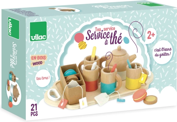 Duży drewniany zestaw do herbaty VILAC zapewnia dzieciom autentyczne wrażenia z zabawy w podwieczorek. Dzięki 21 starannie wykonanym elementom w przyjemnych pastelowych odcieniach dzieci mogą serwować herbatę, częstować makaronikami i ciasteczkami, ucząc się uprzejmości oraz zasad zachowania przy stole.