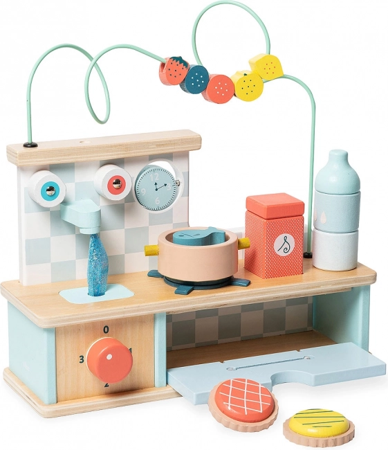 Ta wysokiej jakości drewniana kuchenka VILAC łączy aktywności motoryczne z realistycznymi elementami kuchennymi. Dzieci mogą kręcić pokrętłami, otwierać drzwiczki piekarnika, „gotować rybę” w garnku i „puszczać wodę” w zlewie, a kolorowy labirynt z owocami oraz piętrząca się sól i butelka wspierają wyobraźnię i koordynację ręka-oko.