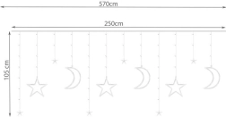 Specjalne diody LED zużywają znacznie mniej energii i nie emitują ciepła, co sprawia, że są energooszczędne i mają długą żywotność aż 35 000 godzin. Całkowita długość zasłony wynosi 570 cm, z różnorodną długością wiszących włókien 105/80/45 cm. Waga produktu to 0,55 kg (wraz z opakowaniem 0,62 kg), co jest lekkie i łatwe do montażu.